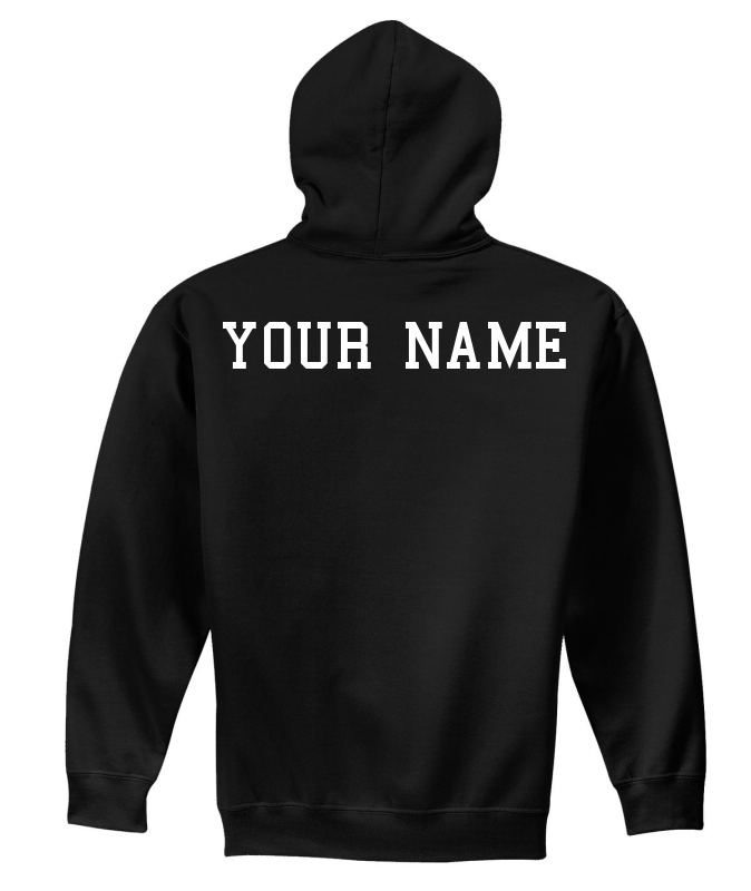 8-ounce 50/50 cotton/poly | Double-needle stitching at waistband and cuffs | Double-lined hood | No drawcord at hood on youth sizes | 1x1 rib knit cuffs and waistband with spandex | Front pouch pocket | Name personalization available on middle back in varisity font; white vinyl on black, royal vinyl on sport grey and white