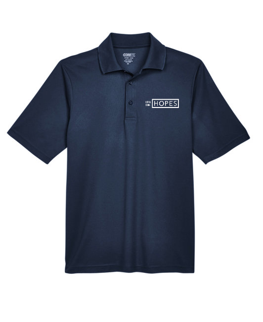 100% polyester pique, 4.1 oz./yd2/140 gsm; Moisture wicking, antimicrobial and UV protection performance; matching flat knit collar | Emboidered logo over the left heart | Optional name personalization in block font on right chest corresponding to left logo color .